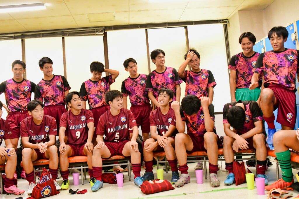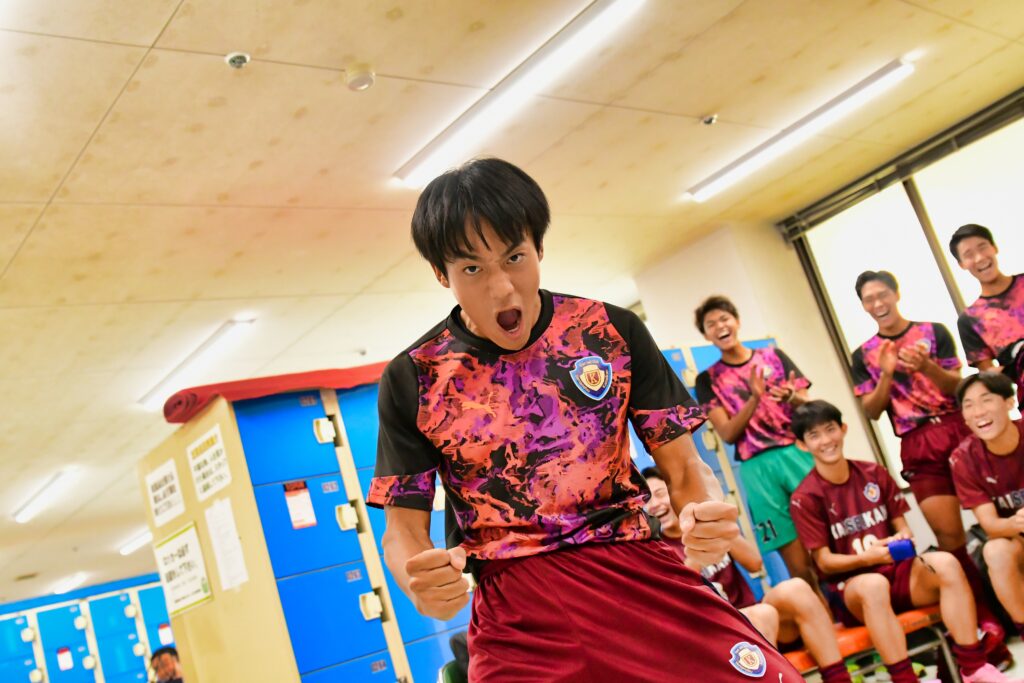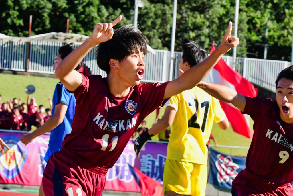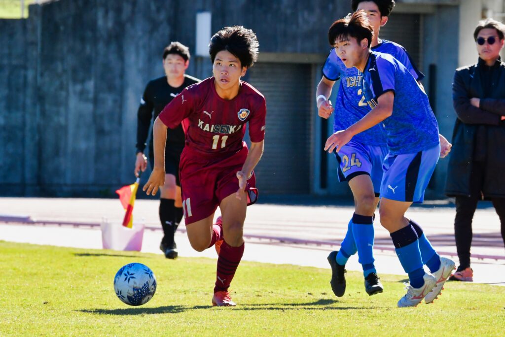 先制点を挙げたのはMF岡田瑛太(3年)だ。前半23分、FW田窪悠己(3年)が落としたところに走り込んでドリブルでゴール前へ。相手GKが前に出て「コースがなかった」が、その股を抜く一撃でネットを揺らした。